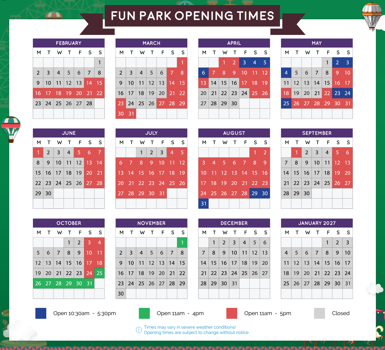Open from the first half term of the year until the last half term of the year (see TIME TABLE at the bottom of this page), with a great range of rides and games from water shooters to the classic Teacup ride, the Fun Park is ideal for toddlers up to 12 year olds.