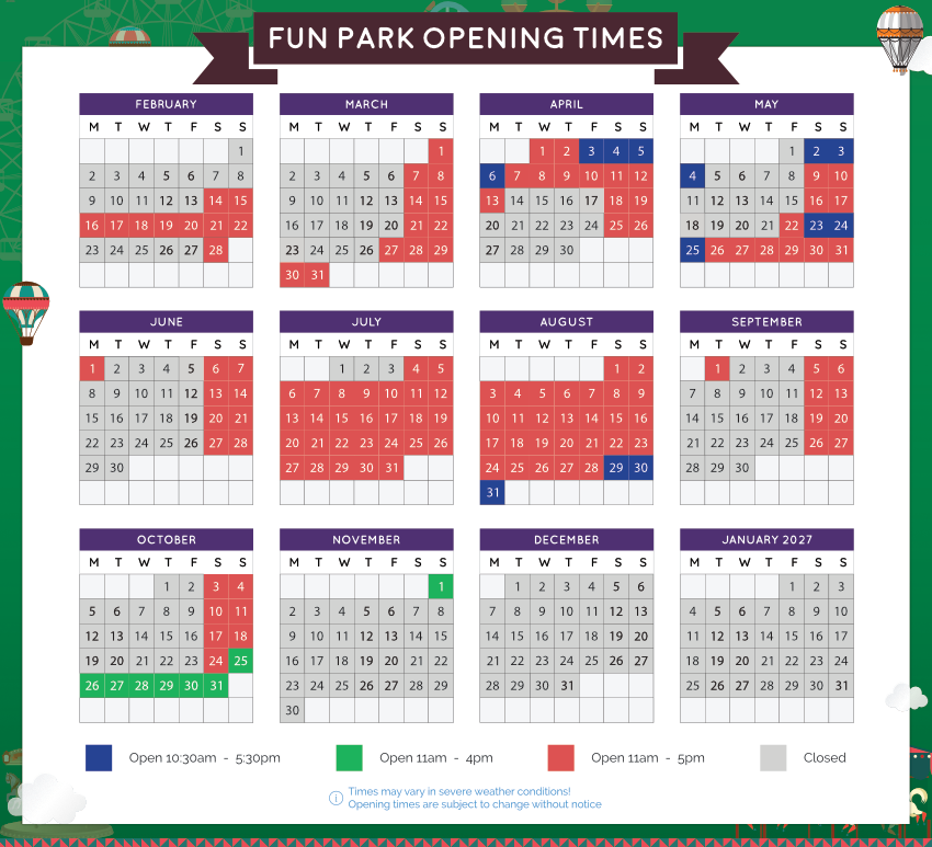 Open from the first half term of the year until the last half term of the year (see TIME TABLE at the bottom of this page), with a great range of rides and games from water shooters to the classic Teacup ride, the Fun Park is ideal for toddlers up to 12 year olds.